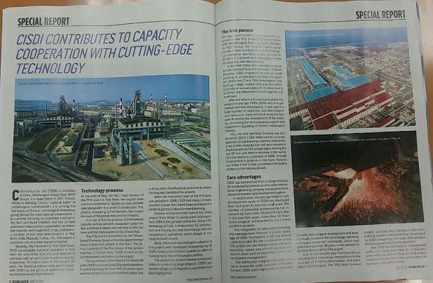 6月29日,《北京周報》(Beijing Review)2017年第25期特別報道欄目以《CISDI CONTRIBUTES TO CAPACITY COOPERATION WITH CUTTING-EDGE TECHNOLOGY》為題對中冶賽迪進行了專題報道,展現了中冶集團冶金建設國家隊風采。《北京周報》是中國唯一的國家級英文新聞周刊,于1958年在周恩來總理的親切關懷下創辦,是中央級重點對外宣傳刊物之一。