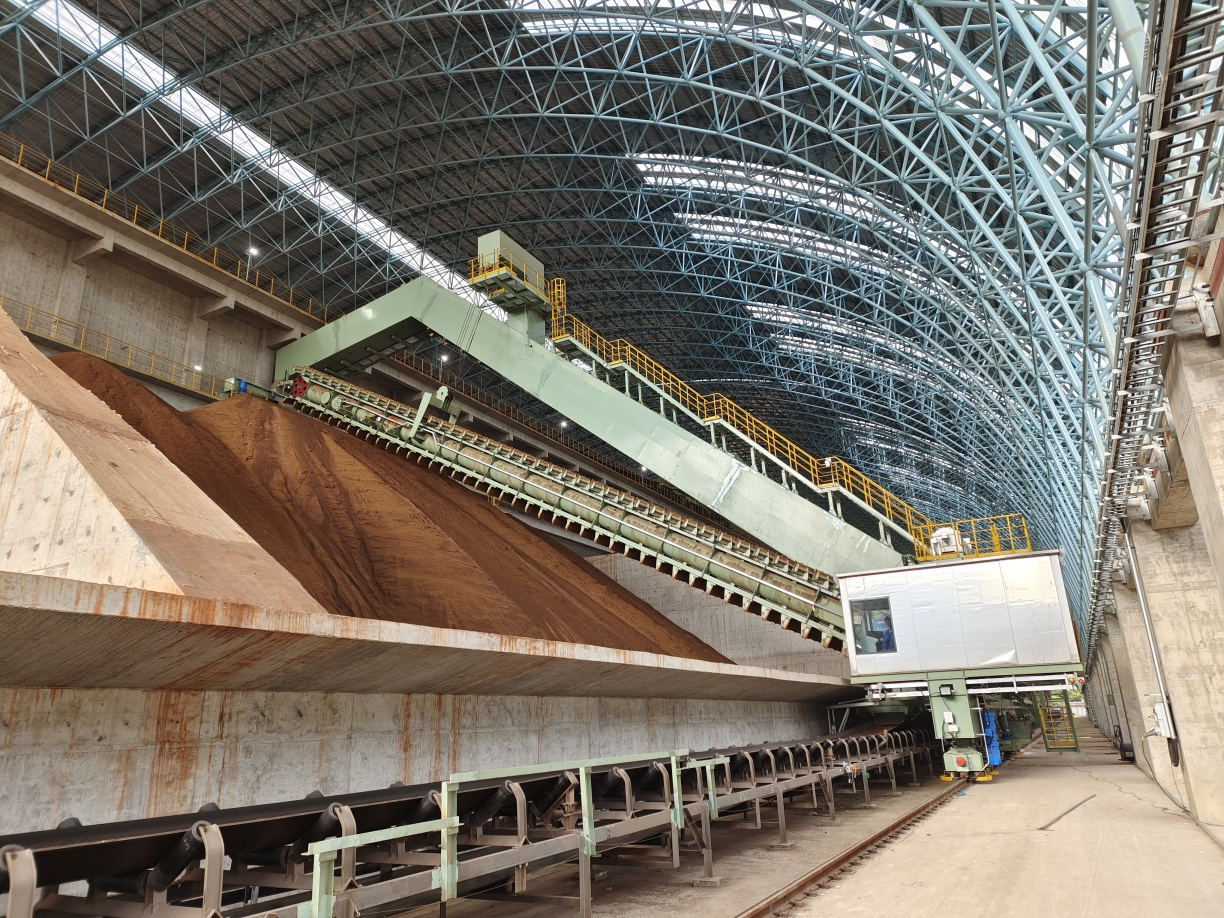其中ECIA-M型封閉式環保料場采用倉+格復合貯料結構,設計總儲量約35萬噸;“因料而異”設計不同的原燃料貯存分區,實現礦石、煤、熔劑等各種原燃料的高效環保貯存。該料場相比傳統原料場,儲料能力能夠提升1~2倍,在相同貯量下,可以節省用地60%左右。